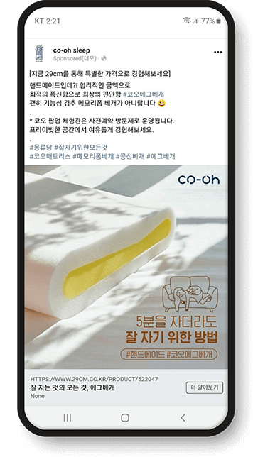Effective on the target floor after mid-thirties. Unlike other social networking sites, you need to prepare advertisements and landings that take advantage of Kakao's unique sensibility.